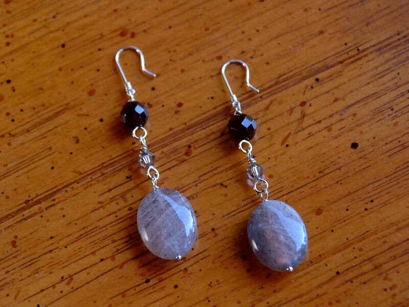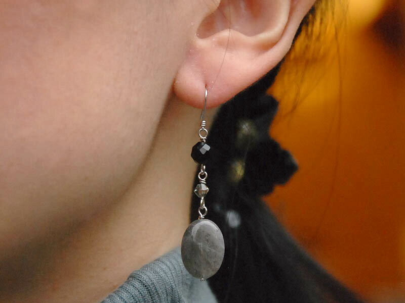 大きなラブラドライトに、ラウンド カットのオニキス、グレー系のスワロ フスキービーズを組み合わせて ロングピアスに仕上げました。