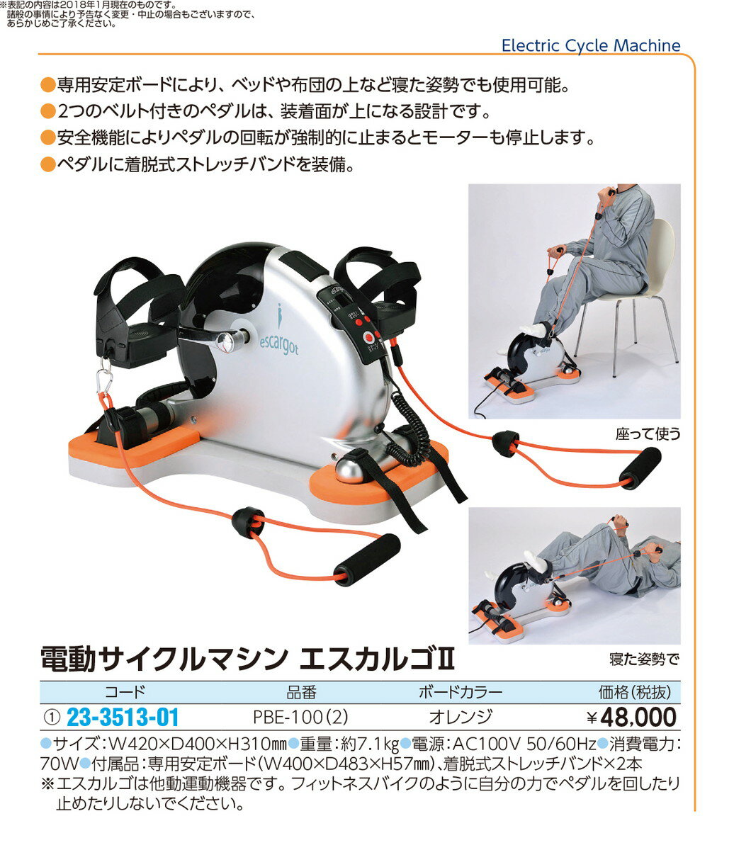 電動サイクルマシン エスカルゴ PBE-100(2)品番 23-3513-011入り 医療機器対象外 専門科目 リハビリ 定価\48000 JAN 4560167941104 ●定価¥48,000円(税別)●商品説明●専用安定ボードにより、ベッドや布団の上など寝た姿勢でも使用可能。
